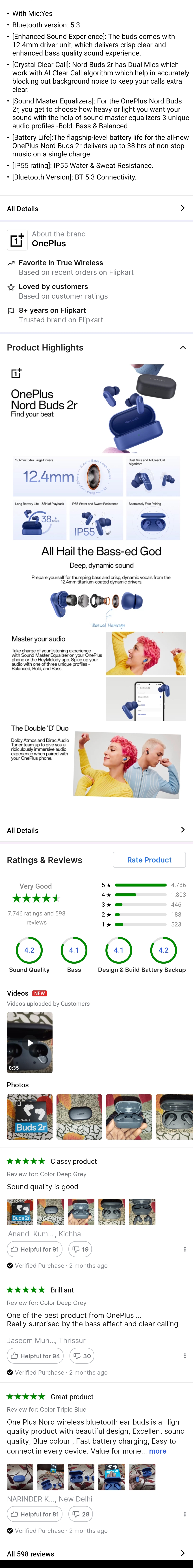 OnePlus Nord Buds 2r True Wireless in Ear Earbuds with Dual Mic & Al Crystal Clear Call Bluetooth Headset (Deep Grey, True Wireless)
